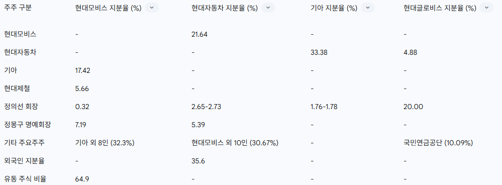 1. 승계의 퍼즐, 현대차그룹 지배구조의 현주소현대자동차그룹은 국내 재계에서 유일하게 복잡한 순환출자 구조를 유지하고 있는 그룹 입니다.이는 정의선 회장의 안정적인 경영권 확보와 지배