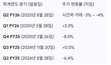 - 부정적 측면: 하지만 전통적인 사업의 성장 둔화와 선행 지표의 부진은 시장의 불안감을 가중시켰고, 이는 실적 발표 직후 주가 하락이라는 냉정한 평가로 이어졌습니다.