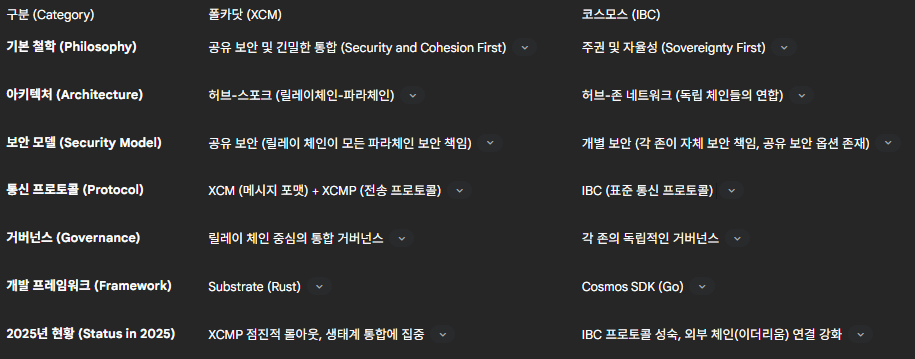 Table 3: 폴카닷(XCM) vs. 코스모스(IBC) 상호운용성 프로토콜 비교